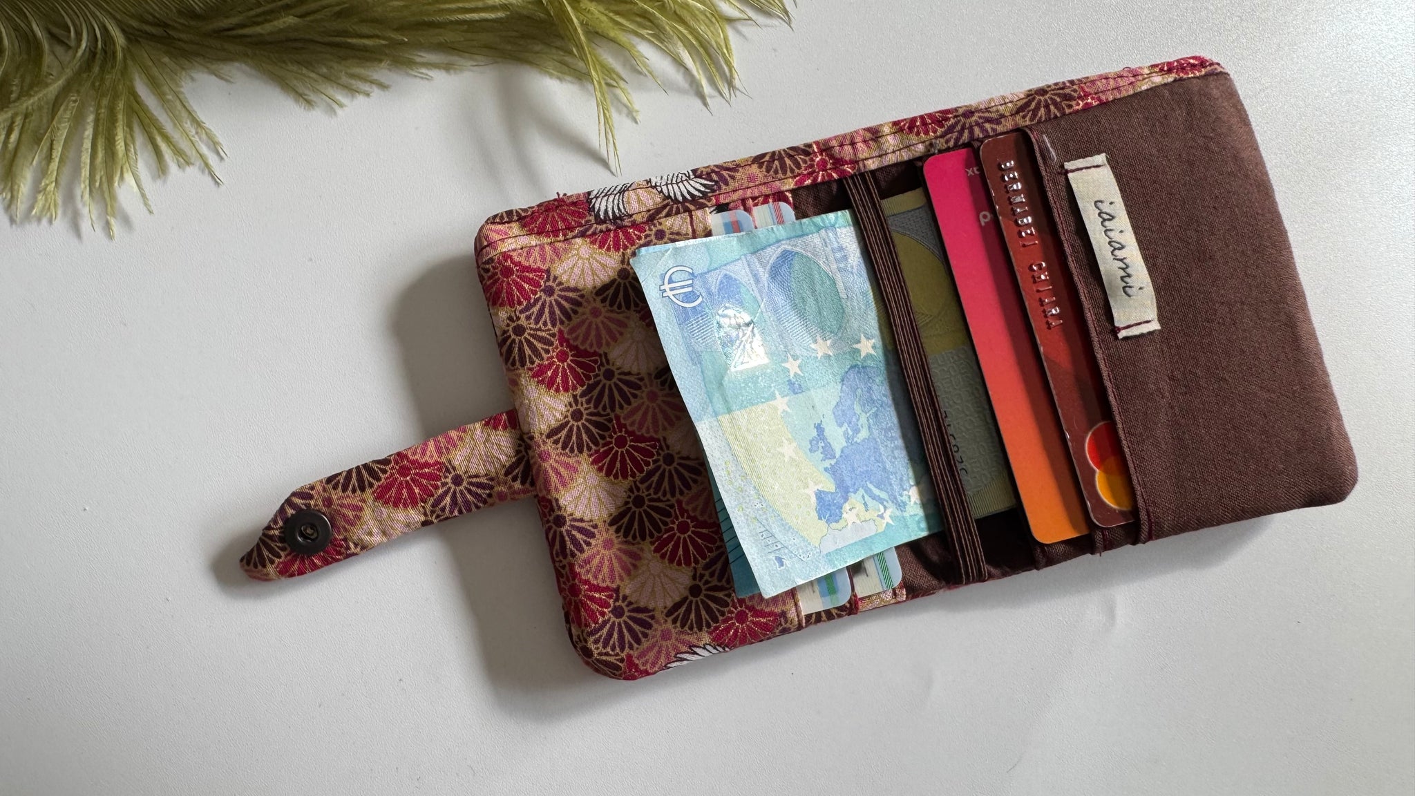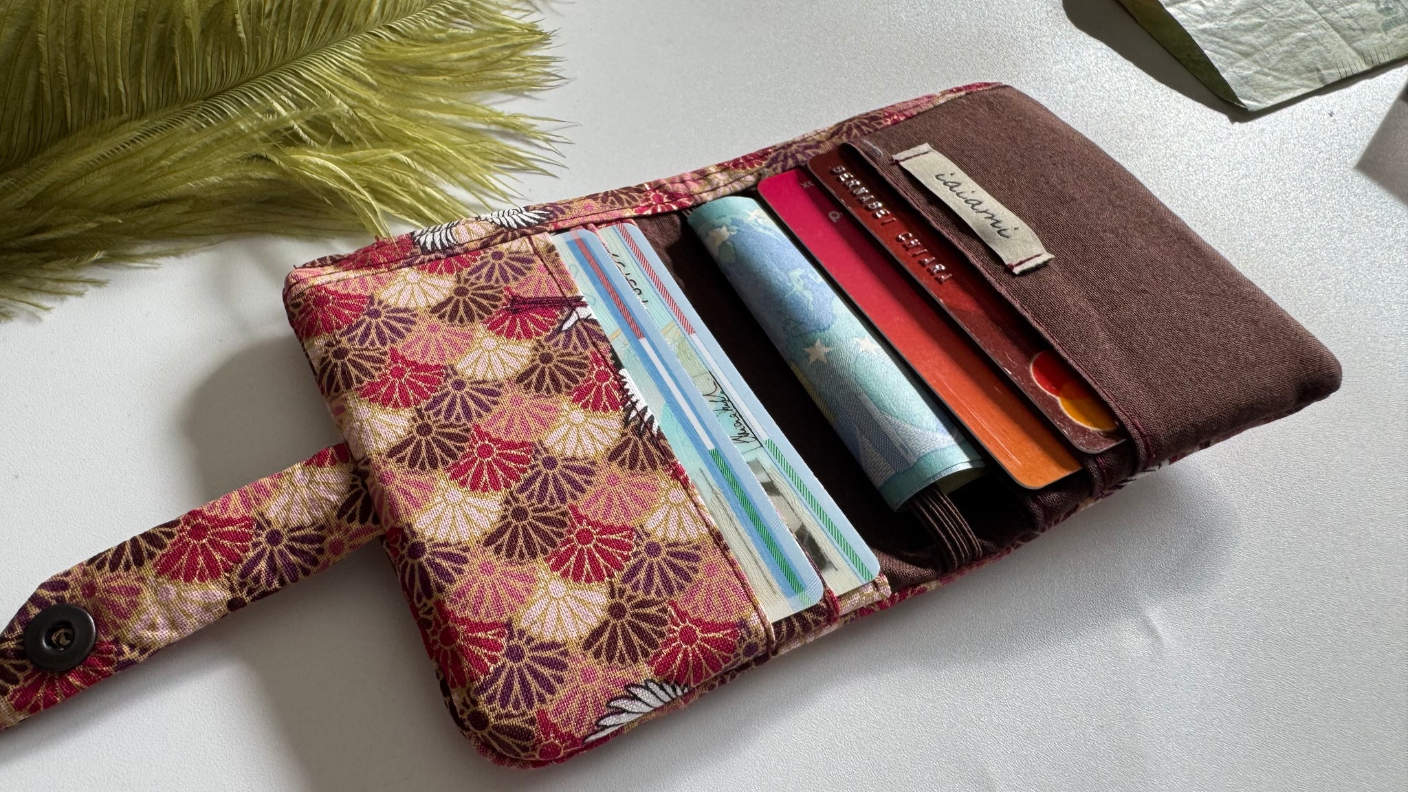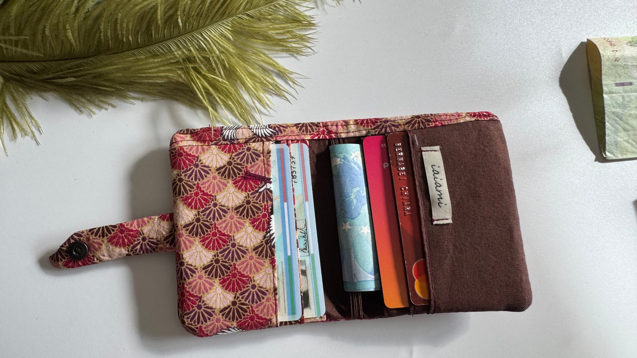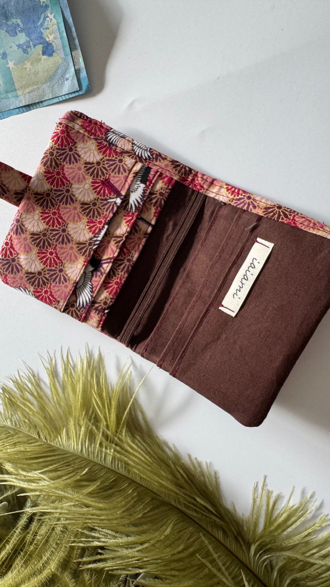 Il portafoglio è in tessuto di cotone, il tessuto e’ stato acquistato a Tokyo durante il mio viaggio in Giappone.