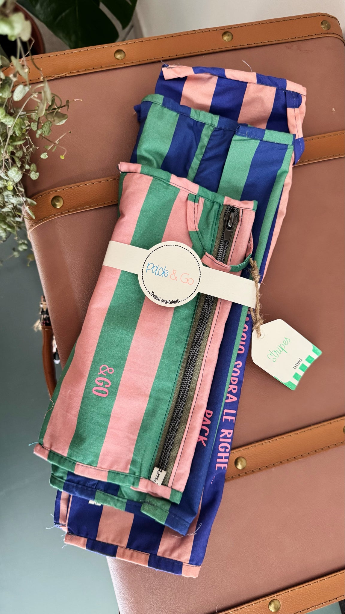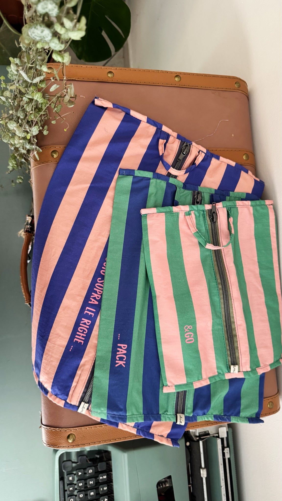 La scritta sul grande: “Viaggio sopra le righe”, viaggio non solo in senso figurativo ma nel modo di vivere ogni giorno, con leggerezza, curiosità e perché no un po’ fuori dagli schemi. Sugli altri due astucci la scritta “Pack & Go” - impacchetta e parti… da qui il nome all’accessorio.