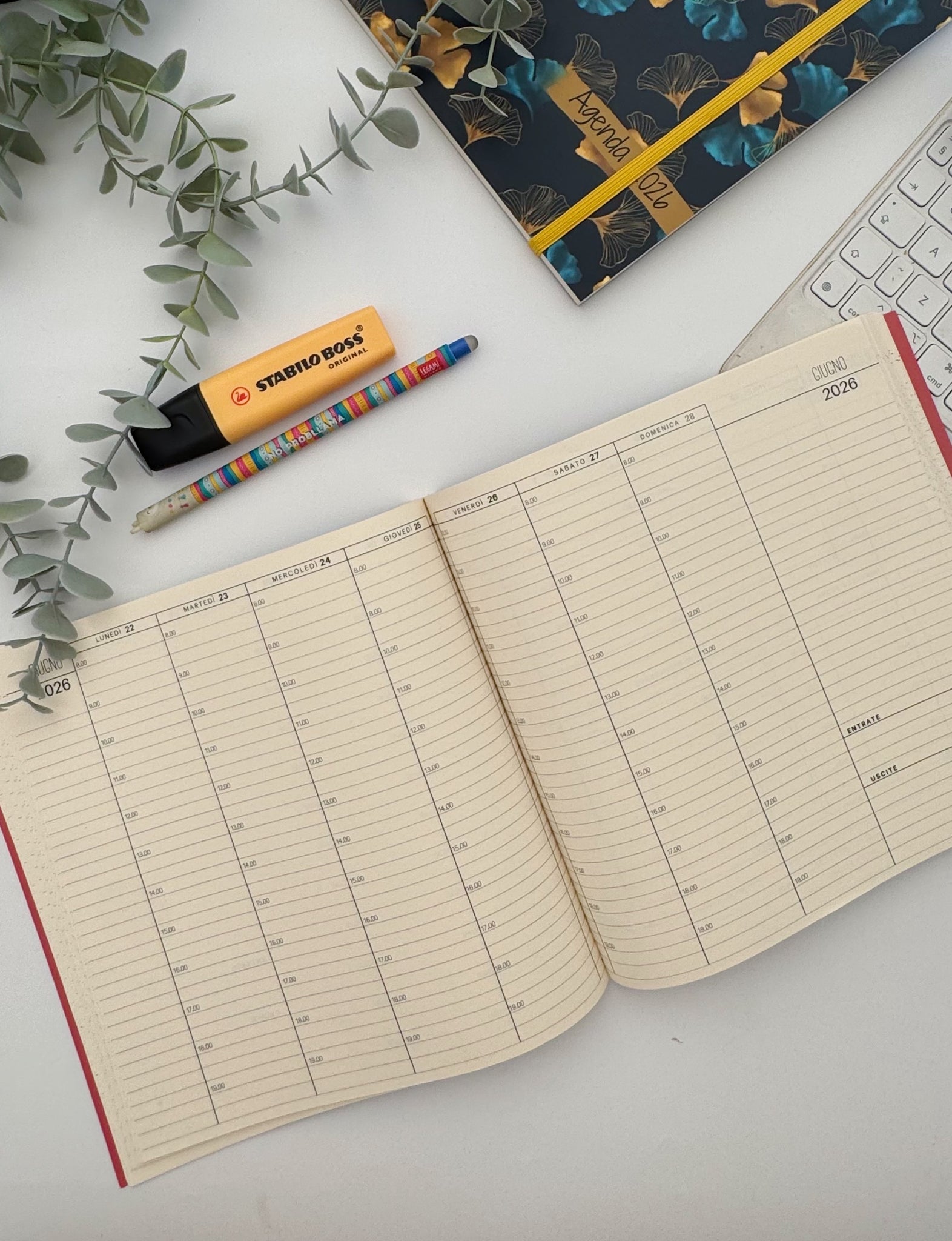 Perfetta per la pianificazione, l’agenda dallo stile minimal, consente uno sguardo d‘insieme su ciascuna settimana. Pensata per essere portata sempre dietro, grazie al formato 20 x 20, ma allo stesso tempo, aperta a 180 gradi consente di avere una visuale completa della settimana, avendo a disposizione per ogni giorno della settimana una colonna. Puoi pianificare dettagliando tutti gli impegni della giornata sia professionali che non.