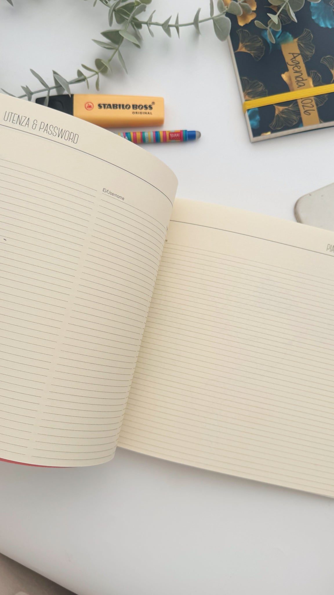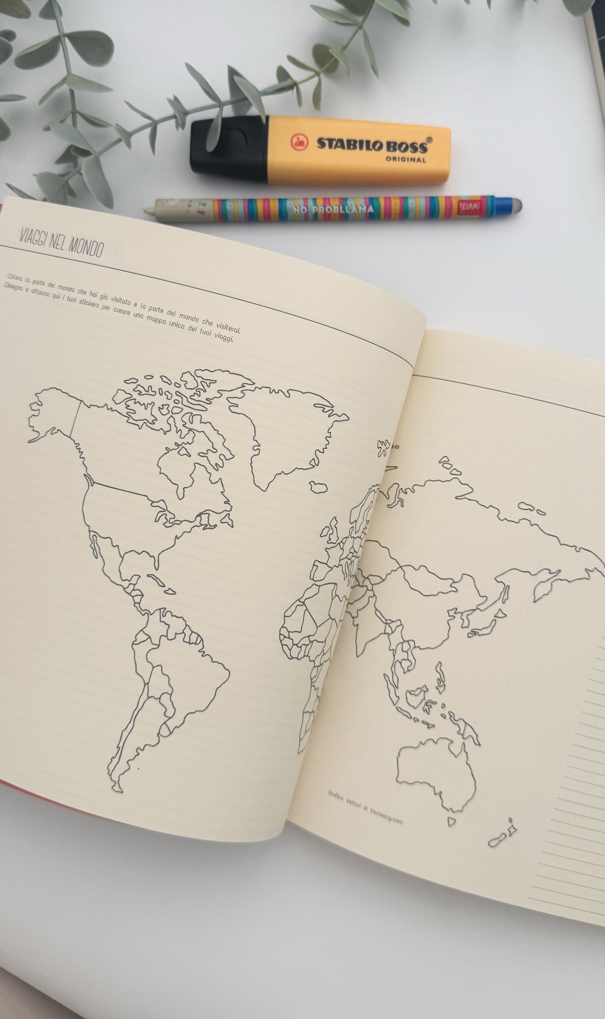 Le pagine sono a righe, ed oltre a pianificare e dettagliare ogni singola settimana, c’è spazio anche per la creatività. Con pagine bianche (“Prenditi Tempo”), pagine a righe non datate (“Note Extra”), pagine dedicate al budget annuale e mensile (entrate e uscite), pagine dedicate ai viaggi (con cartina mappamondo connessa) puoi liberare la tua creatività, scrivendo pensieri, attaccando foto, disegnando, colorando e giocando con gli stickers.