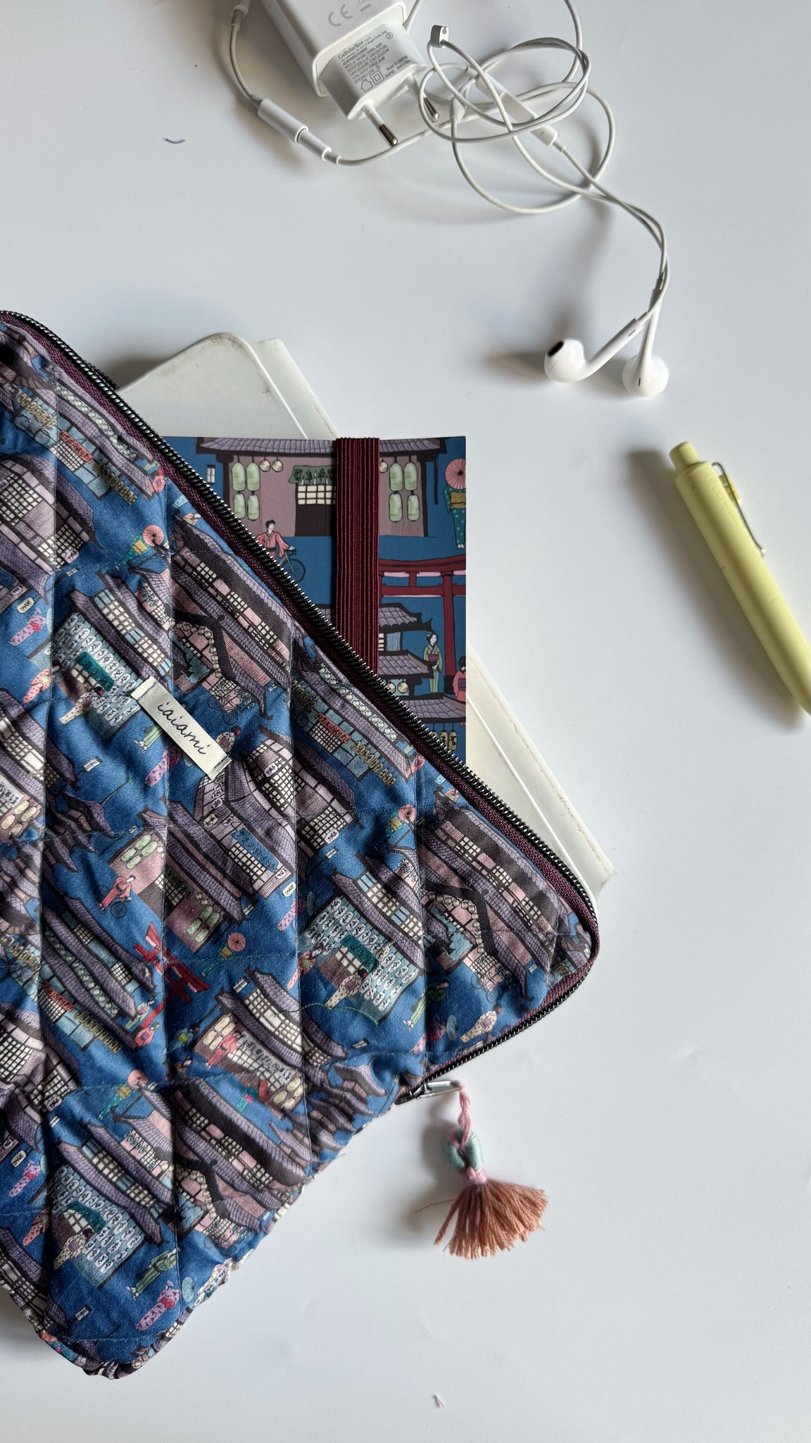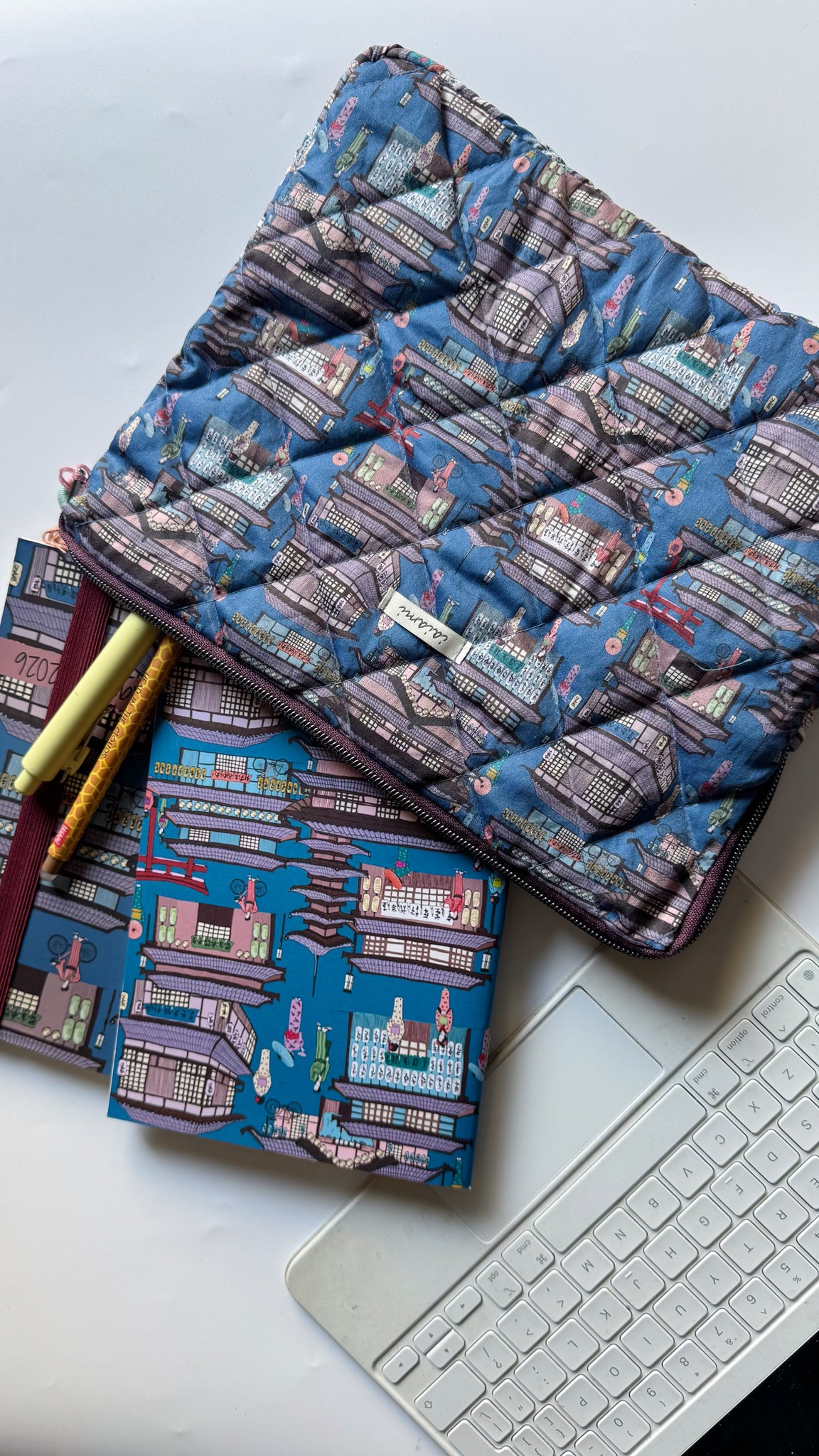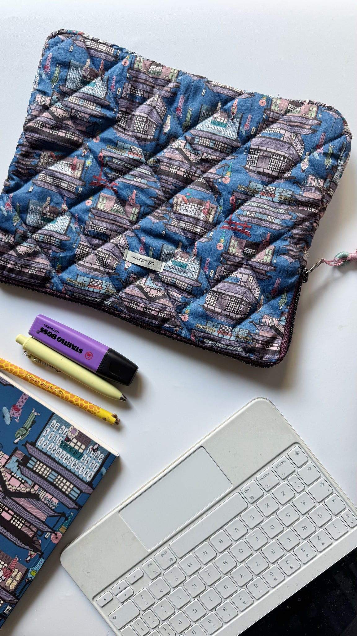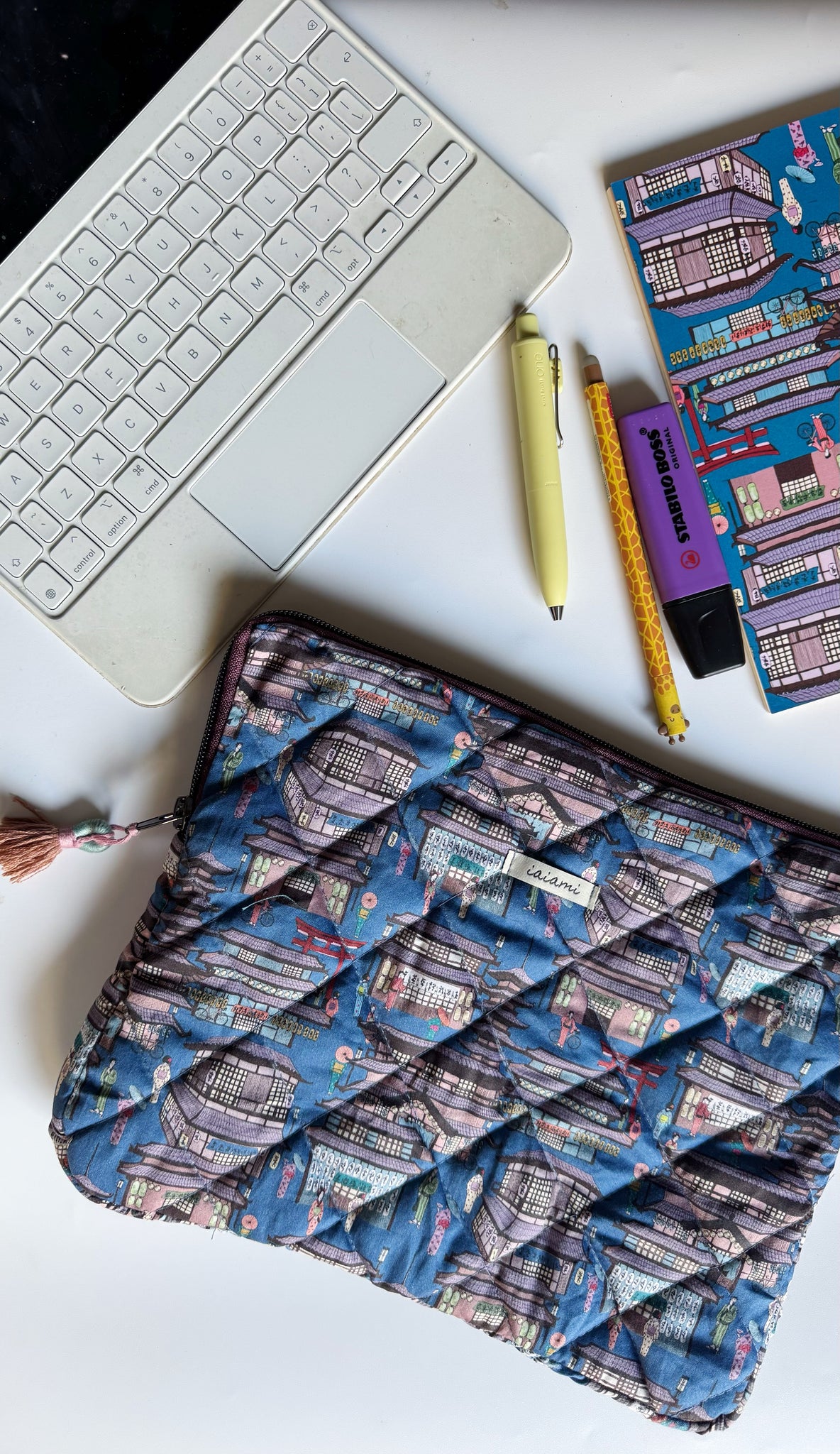 La custodia è realizzata completamente a mano in tessuto di cotone trapuntato. La custodia per tablet/iPad può contenere tablet/iPad di massimo 11’’ o inferiore (adatta fino alle dimensioni di un tablet e Keyboard di 25.86 x 20.21 x 2.2 cm).