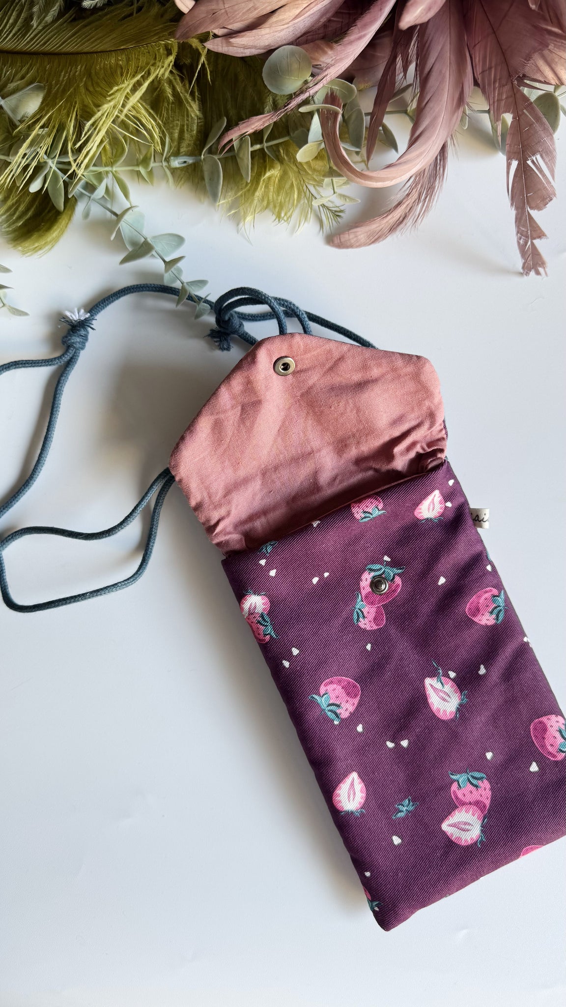 L’astuccio porta telefono, con laccio in corda di 3,5 mm di diametro, è realizzato completamente a mano in tessuto twill di cotone.
