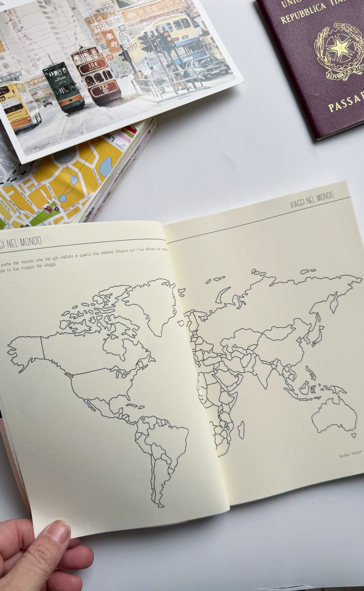 Pensato come diario di viaggio, per la pianificazione dei viaggi e per catturare tramite bigliettini, foto e voucher ricordi di un viaggio fantastico. Le prime pagine precompilate, per scrivere le informazioni principali del viaggio, la sezione viaggi nel mondo con il planiafero per colorare la parte del mondo che si vuole visitare e per attaccare stickers o altro. Le restanti pagine bianche per personalizzare e creare un fantastico diario di viaggio.