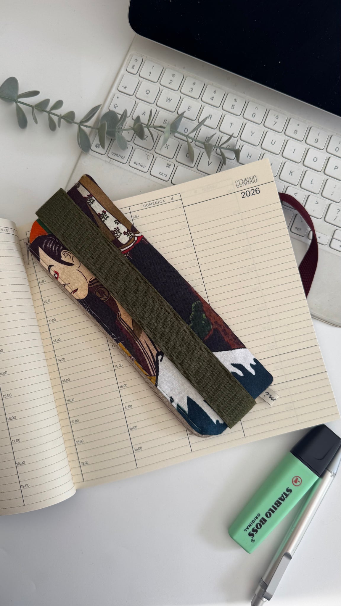 L’astuccio con elastico, praticissimo per non dimenticare penne, matite, post-it e tutto l’occorrente per la vostra agenda, taccuini e libri.