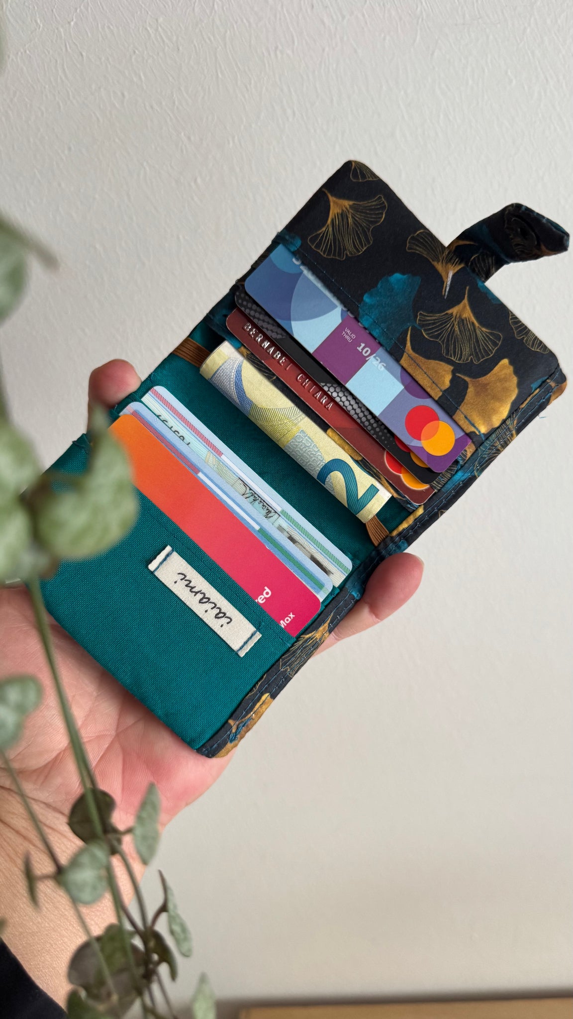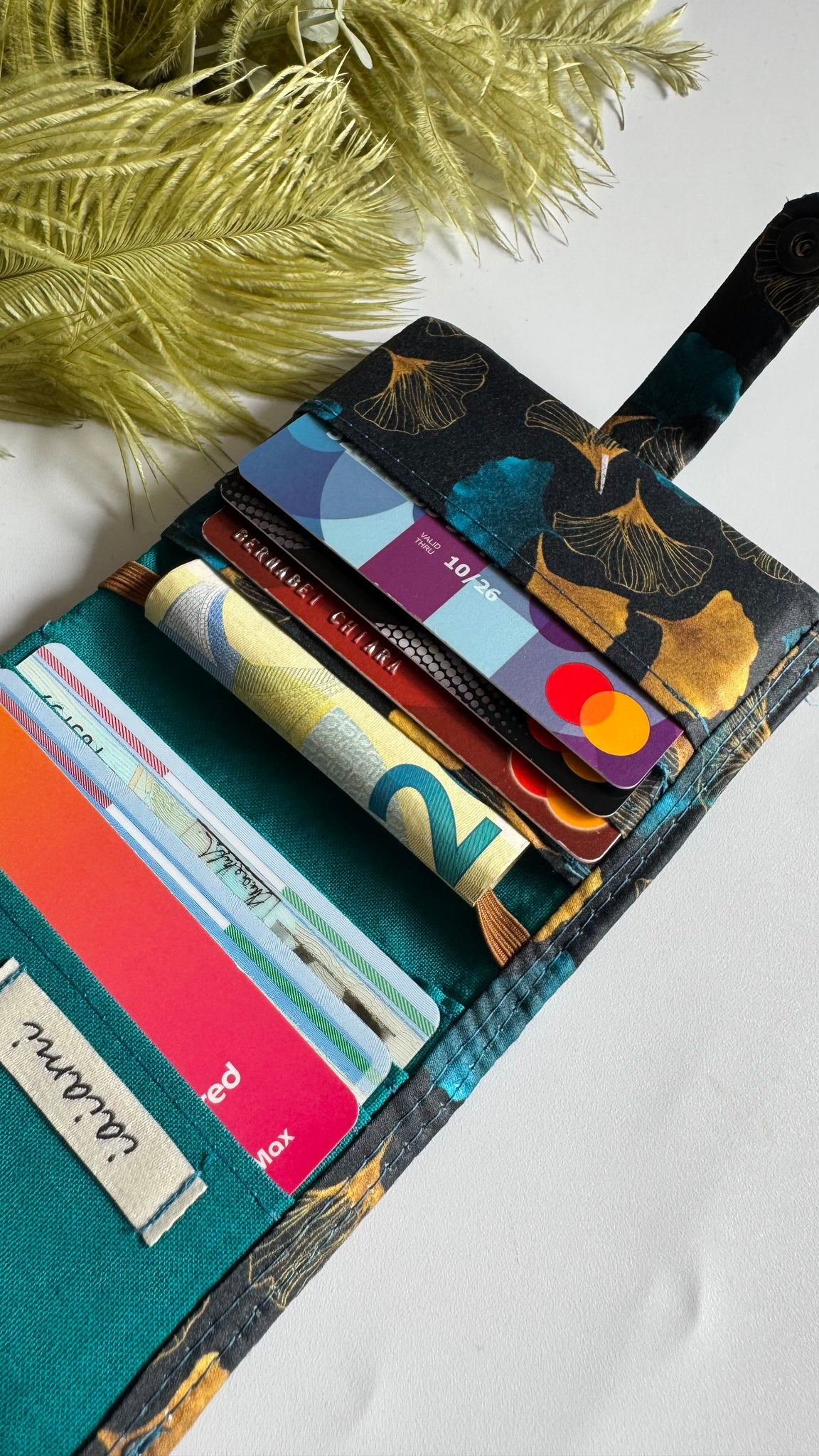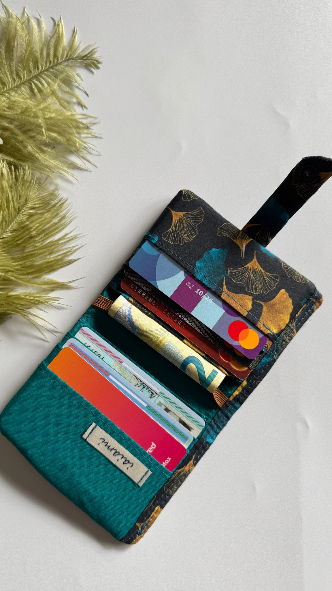 Realizzato a mano, ha 8 taschini, 6 per le tessere/carte e due più capienti.