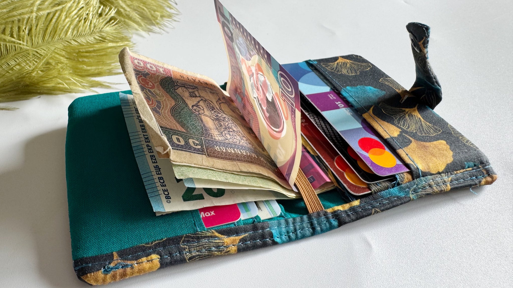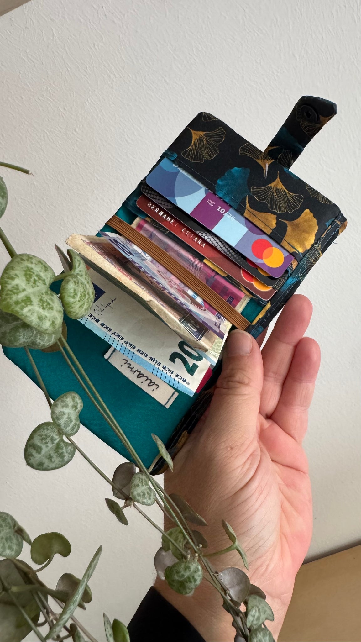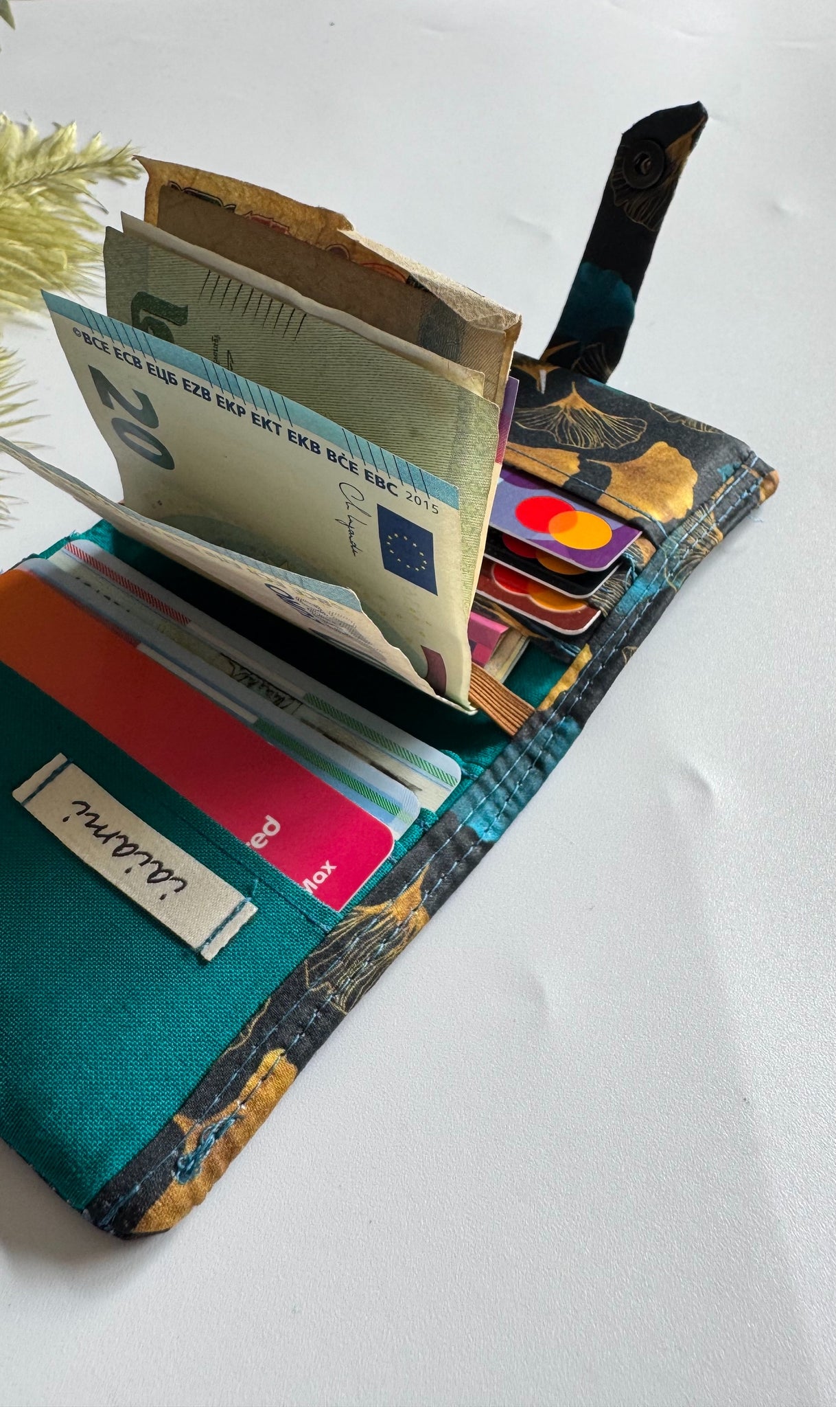 Una delle due tasche più capienti è stata pensata per inserire le banconote, o piegate, oppure aperte. Grazie all’elastico, le banconote possono essere inserite facendole scivolare sotto l’elastico infilandole una parte nella tasca grande. In questo modo, grazie all’elastico le banconote rimangono bloccate. Per una maggiore sicurezza, l’altra parte libera delle banconote si può inserire, piegandole, all’interno della tasca. Per scegliere le banconote da utilizzare, basta sfilare la banconota che ci interessa senza farle uscire tutte.