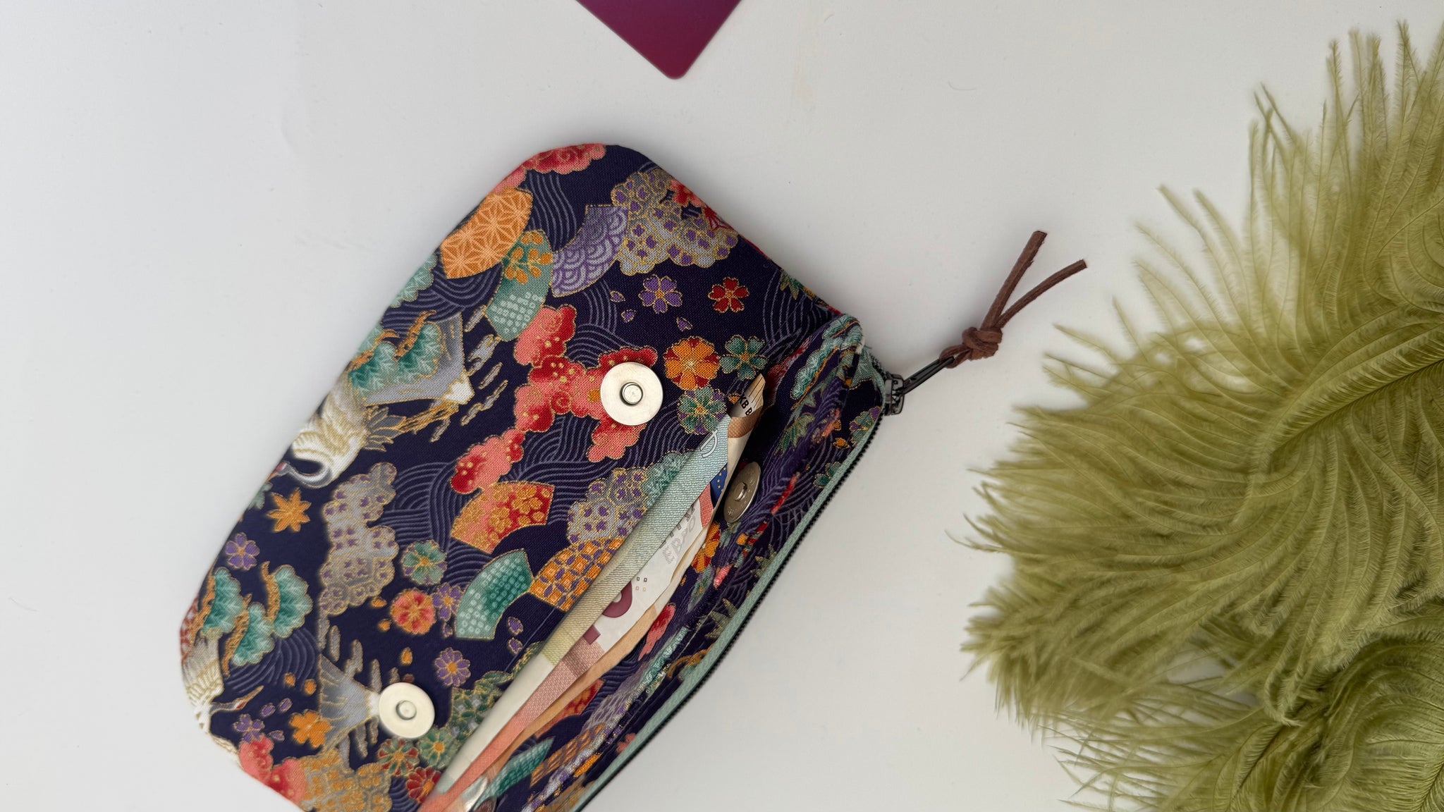 Pensata come un portafoglio slim che può contenere nella tasca grande (con chiusura lampo) i documenti (carta d’identità o passaporto),  carte/tessere, contanti o altro, nella tasca piccola cn apertura con i bottoni magnetici le banconote, nella tasca sul retro le monetine.