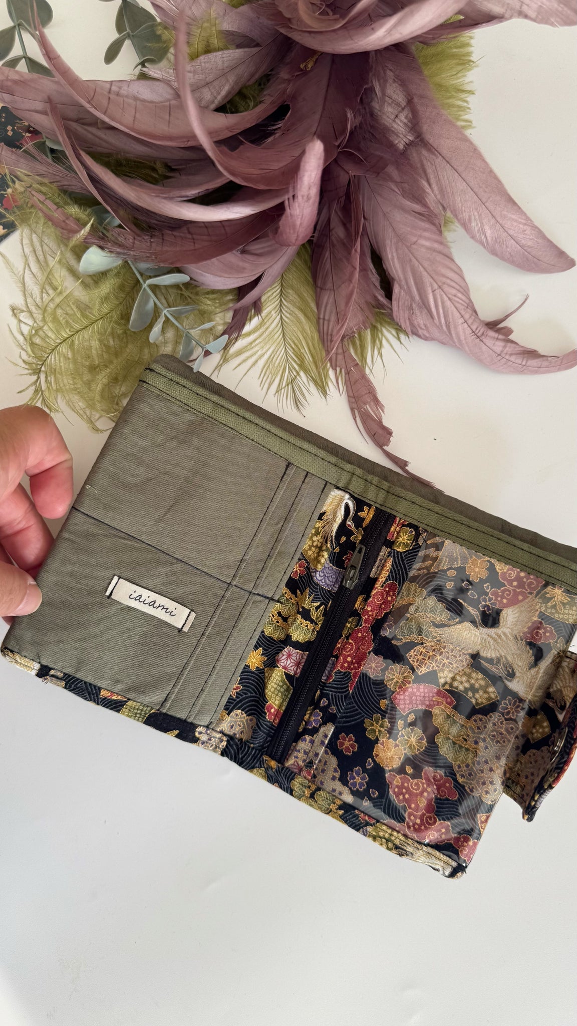 Ha 6 taschini per tessere e carte, una tasca grande in tessuto per soldi di carta che prende tutta la grandezza del portafoglio aperto, una tasca grande con cerniera per le monetine e una tasca trasparente pensata per i documenti o soldi o altro.